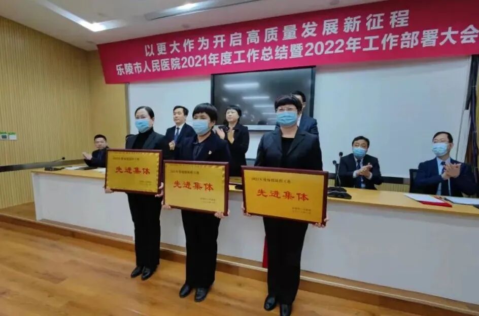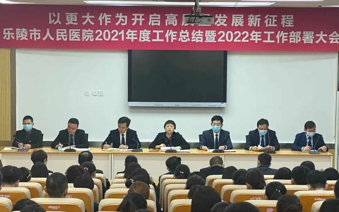 2022年1月28日下午,乐陵市人民医院召开题为“以更大作为开启高质量发展新征程”的2021年总结表彰暨2022年工作部署会议,总结医院发展取得的成绩和经验,对2021年度做出较大贡献的科室、集体及个人进行通报表扬,并安排部署2022年医院重点工作。医院全体领导班子、中层领导共百余人现场参会,全院职工通过线上直播的形式共同参与。会议由医院党委副书记、工会主席殷盈祥主持。
