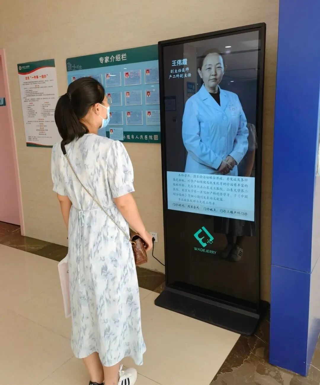 同时,各门诊区设置立式信息发布显示屏,公示专家个人简介、出诊信息。科技感十足,画面高清,满足群众就诊需求。