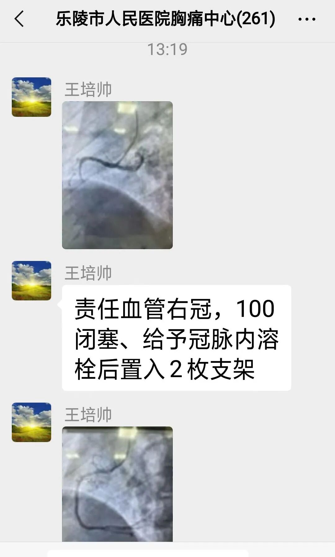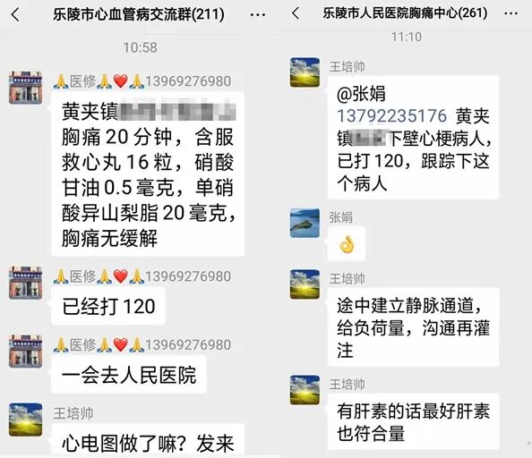 乐陵市心血管交流群突然跳出一组信息——黄夹镇某村殷某某突发胸痛20分钟,已给予含服速效救心丸16粒,硝酸甘油0.5mg,单硝酸异山梨酯20mg症状无缓解,已拨打120去人民医院。我院冠脉介入医疗组王培帅医师看完心电图立即将信息转入我院胸痛群并@院前急救护士长张娟追踪该患者,同时嘱咐途中紧急预先处理。