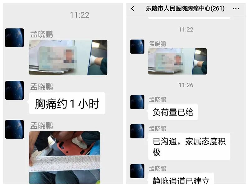 院前急救医师孟晓鹏发回信息——符合急性心肌梗死诊断,负荷量已给、已建立静脉通道、家属积极同意急诊介入手术。