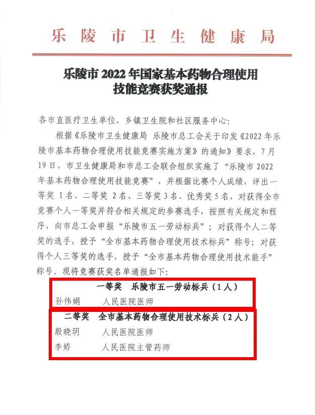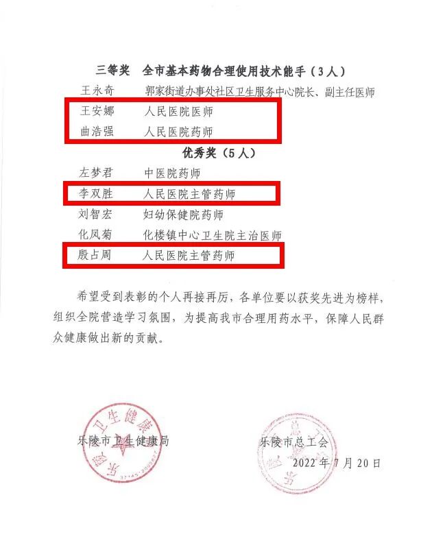 7月22日,我院收到来自乐陵市卫生健康局、乐陵市总工会联合印发的“乐陵市2022年国家基本药物合理使用技能竞赛获奖通报”,我院7名同志荣获佳绩!其中,孙伟娟获得一等奖并按规定和程序向市总工会申报“乐陵市五一劳动标兵”;殷晓玥、李娇获得二等奖,被授予“全市基本药物合理使用技术标兵”称号;王安娜、曲浩强获得三等奖,被授予“全市基本药物合理使用技术能手”称号。